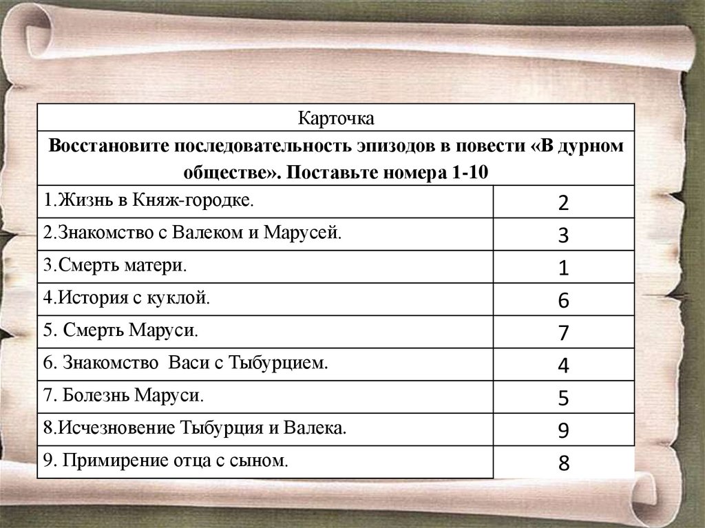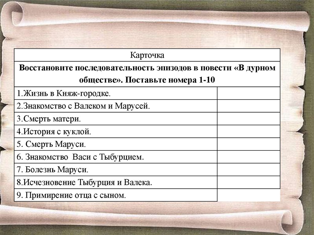 КарточкаВосстановите последовательность эпизодов в повести «В дурном