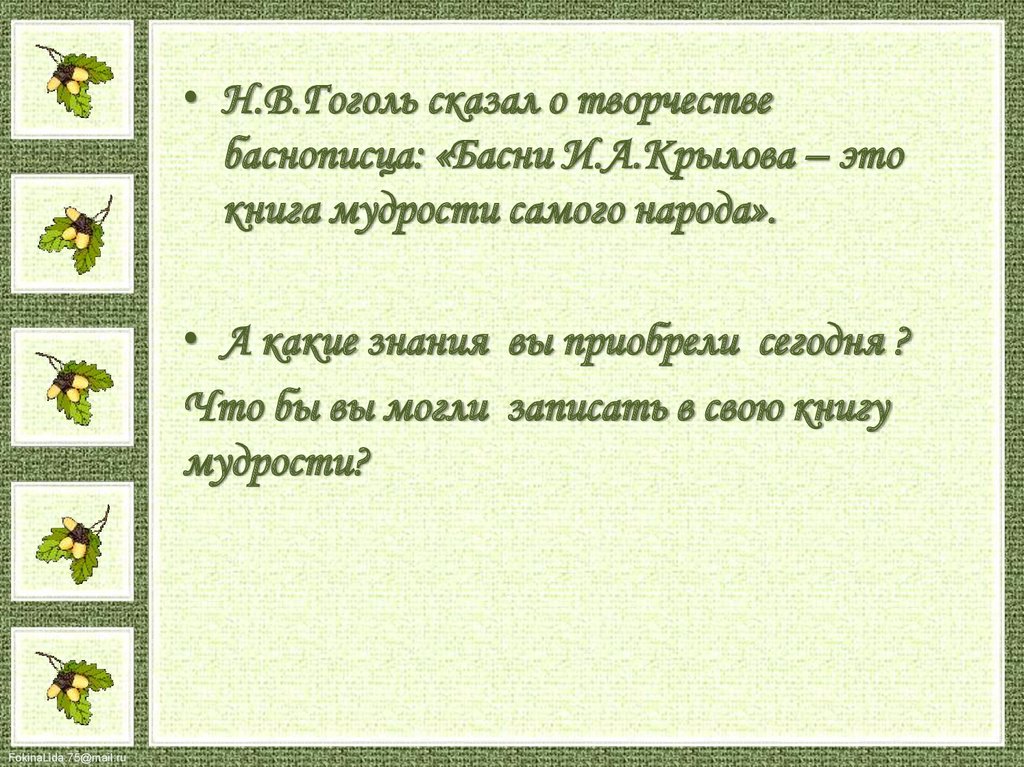 • Н.В.Гоголь сказал о творчествебаснописца: «Басни И.А.Крылова – это