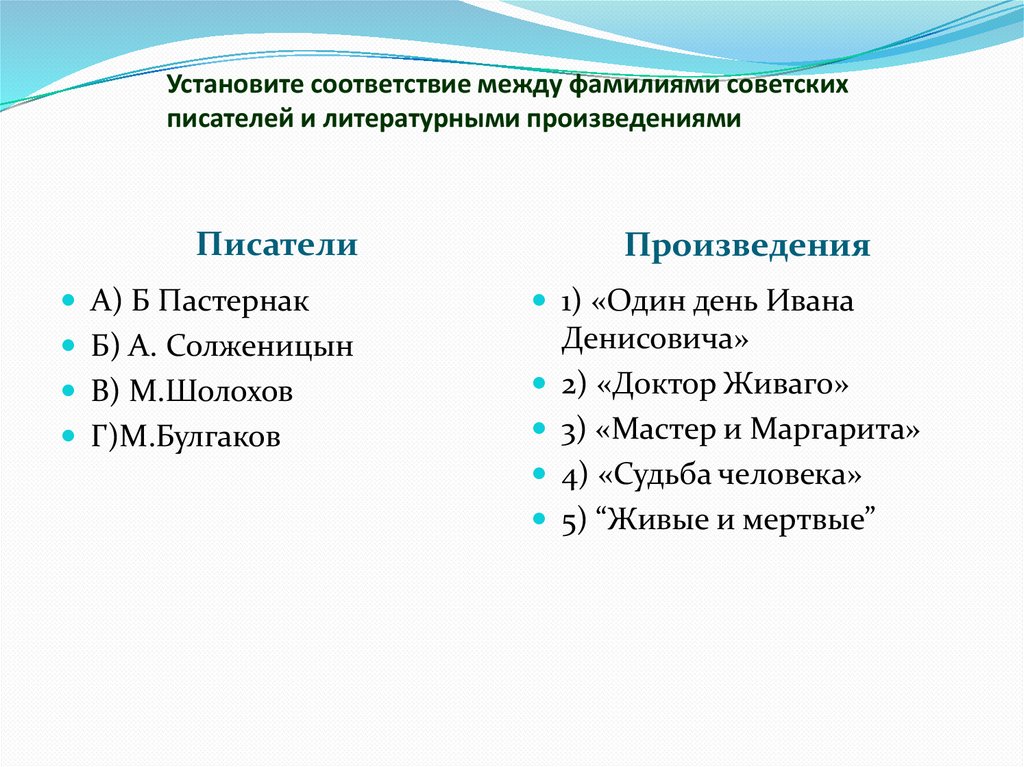 Установите соответствие между фамилиями советскихписателей и литературными произведениями