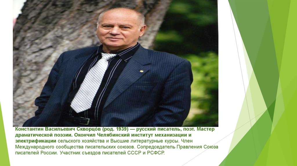 Константин Васильевич Скворцо́в (род. 1939) — русский писатель, поэт. Мастердраматической поэзии. Окончил Челябинский институт механизации и