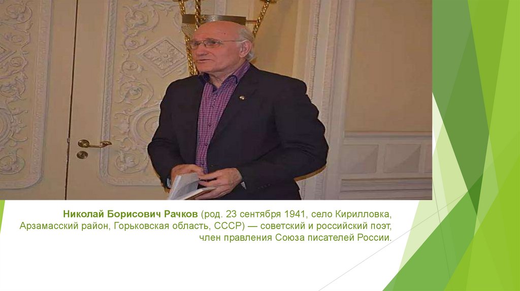 Николай Борисович Рачков (род. 23 сентября 1941, село Кирилловка,Арзамасский район, Горьковская область, СССР) — советский и российский поэт,