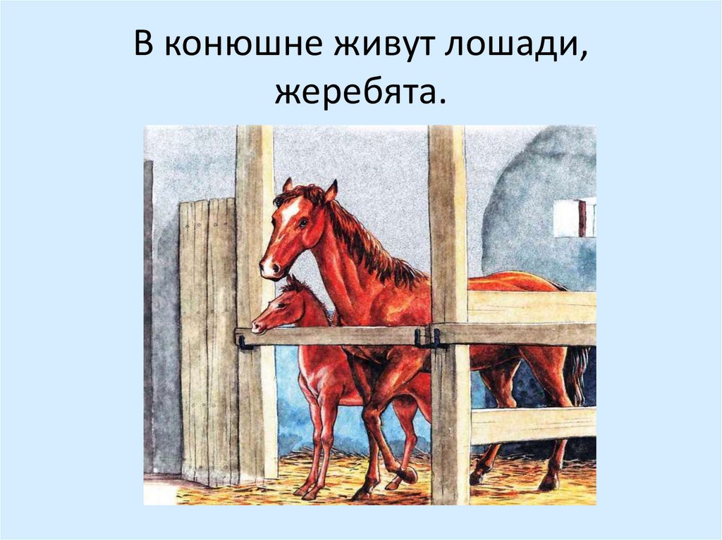 В конюшне живут лошади,жеребята.