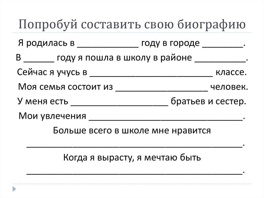 Попробуй составить свою биографиюЯ родилась в ____________ году в городе ________.