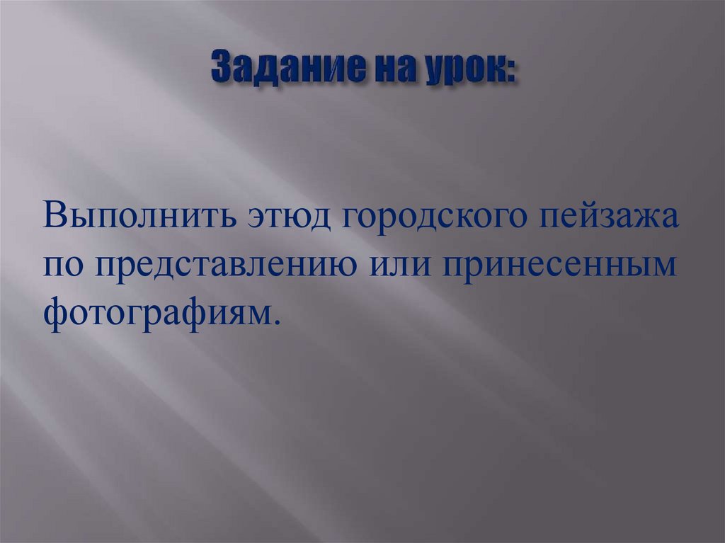 Выполнить этюд городского пейзажапо представлению или принесенным