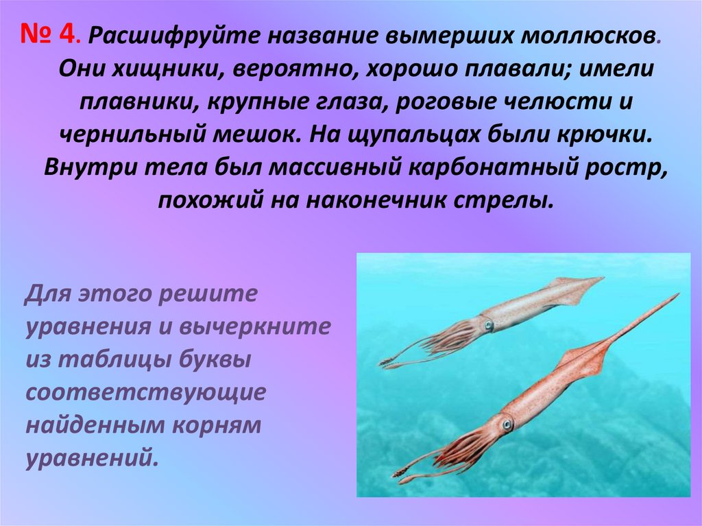 № 4. Расшифруйте название вымерших моллюсков.Они хищники, вероятно, хорошо плавали; имели