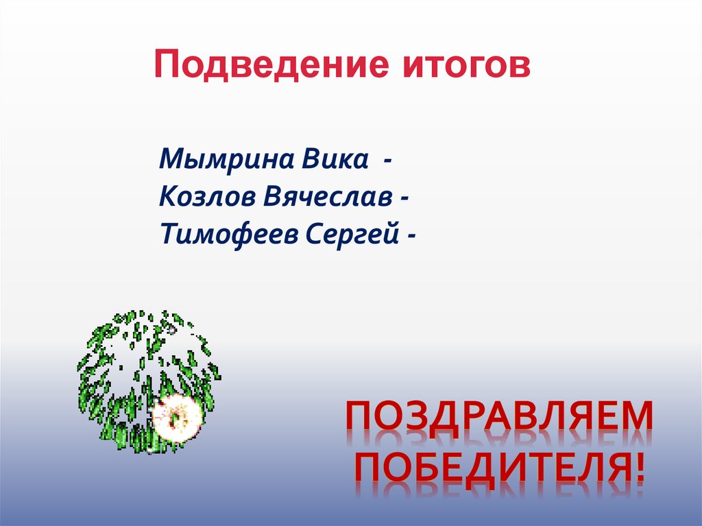 Подведение итоговМымрина Вика Козлов Вячеслав Тимофеев Сергей -