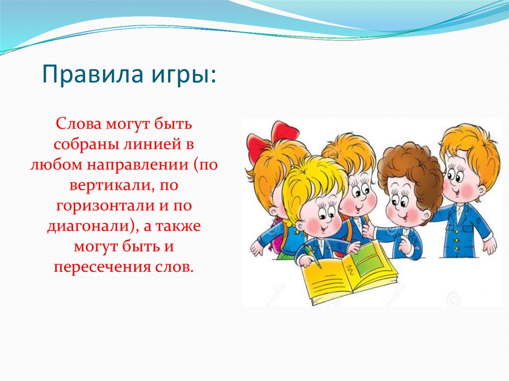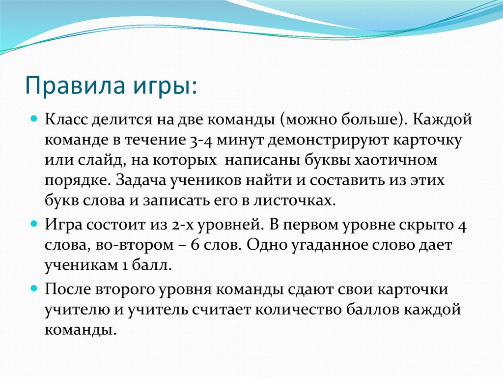 Правила игры:Класс делится на две команды (можно больше). Каждой