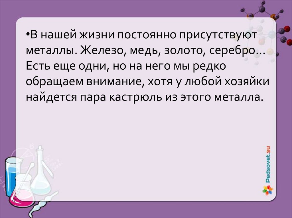 •В нашей жизни постоянно присутствуютметаллы. Железо, медь, золото, серебро…