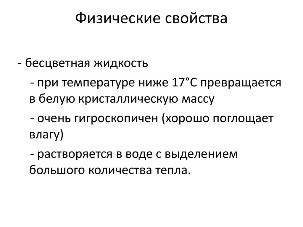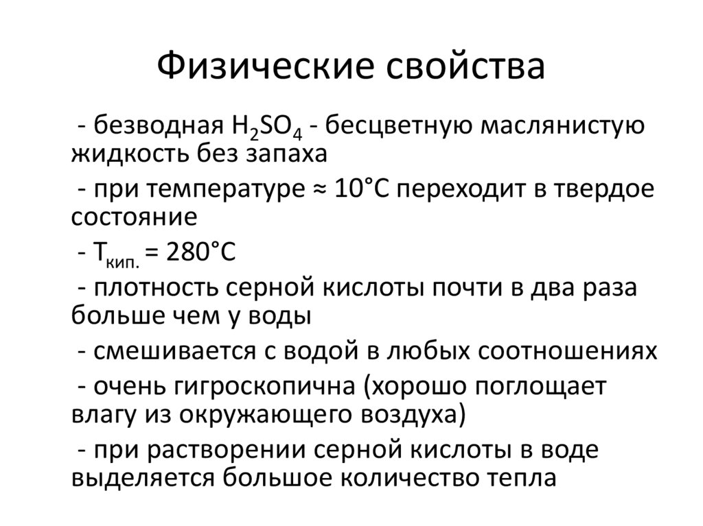 Физические свойства- безводная H2SO4 - бесцветную маслянистую
