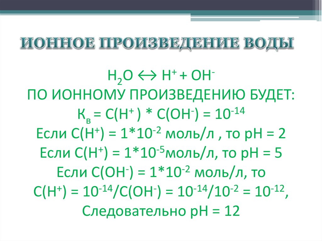 Н2О ↔ Н+ + ОНПО ИОННОМУ ПРОИЗВЕДЕНИЮ БУДЕТ:Кв = С(Н+ ) * С(ОН-) = 10-14