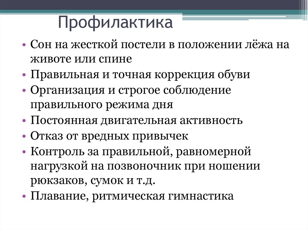 Профилактика• Сон на жесткой постели в положении лёжа на