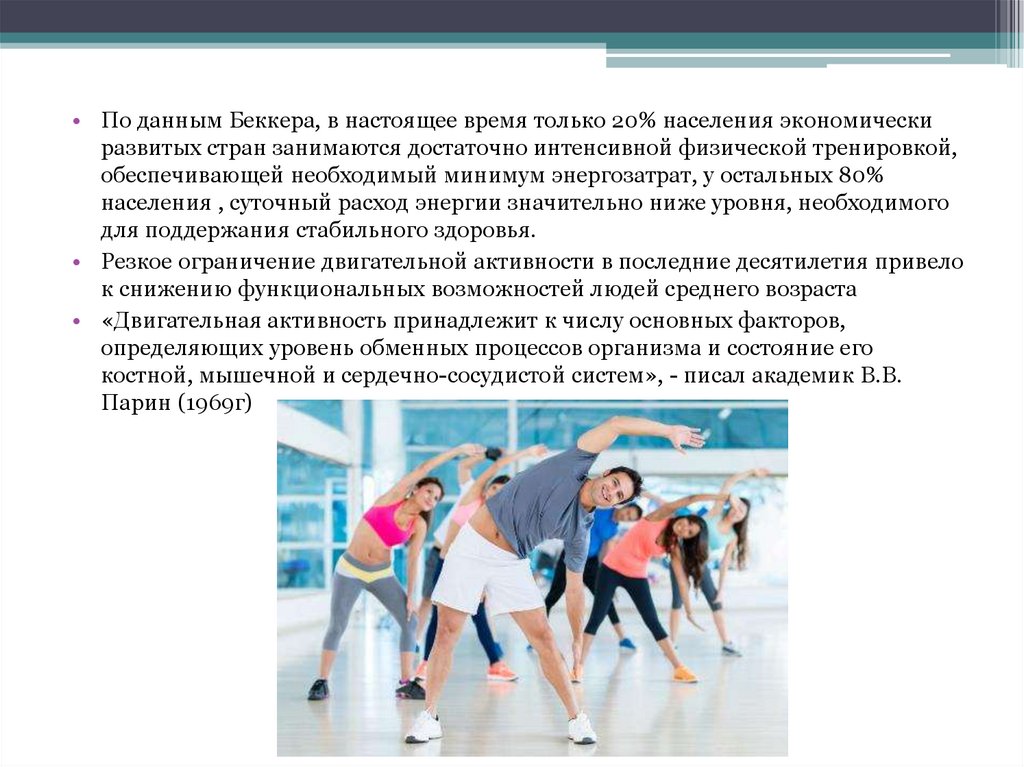 • По данным Беккера, в настоящее время только 20% населения экономическиразвитых стран занимаются достаточно интенсивной физической тренировкой,