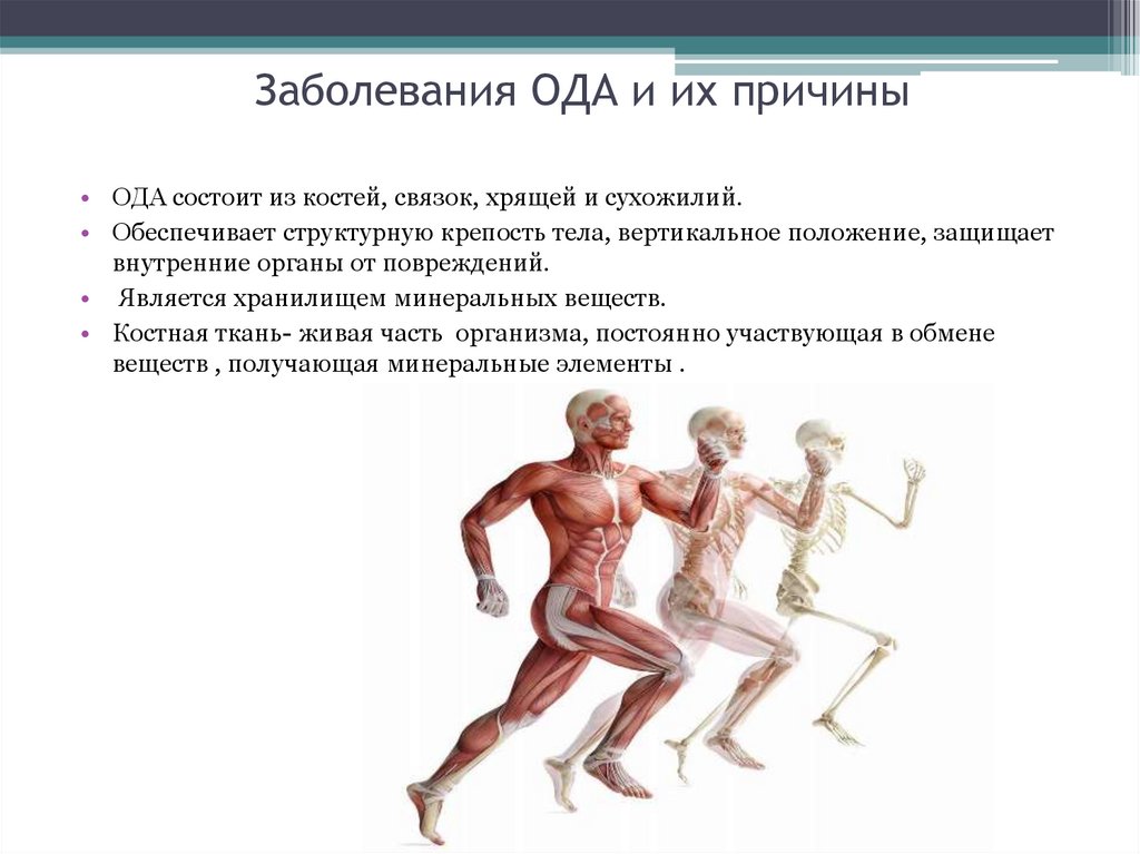Заболевания ОДА и их причины• ОДА состоит из костей, связок, хрящей и сухожилий.