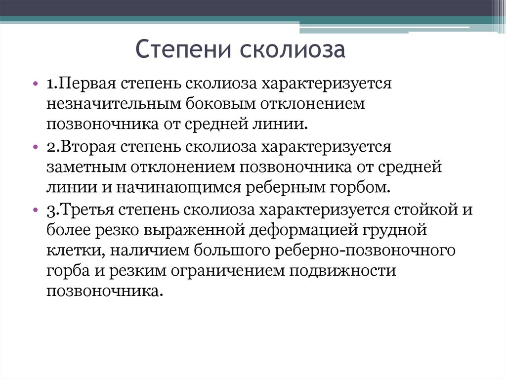Степени сколиоза• 1.Первая степень сколиоза характеризуется