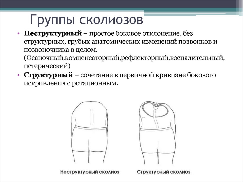Группы сколиозов• Неструктурный – простое боковое отклонение, без