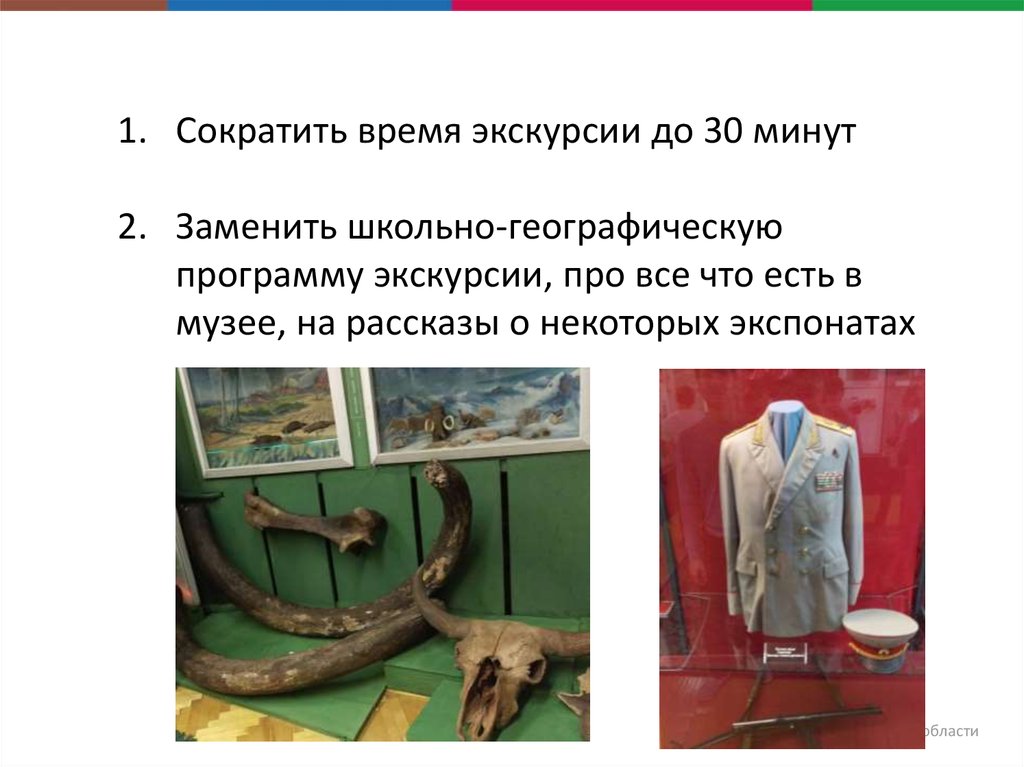 1. Сократить время экскурсии до 30 минут2. Заменить школьно-географическую