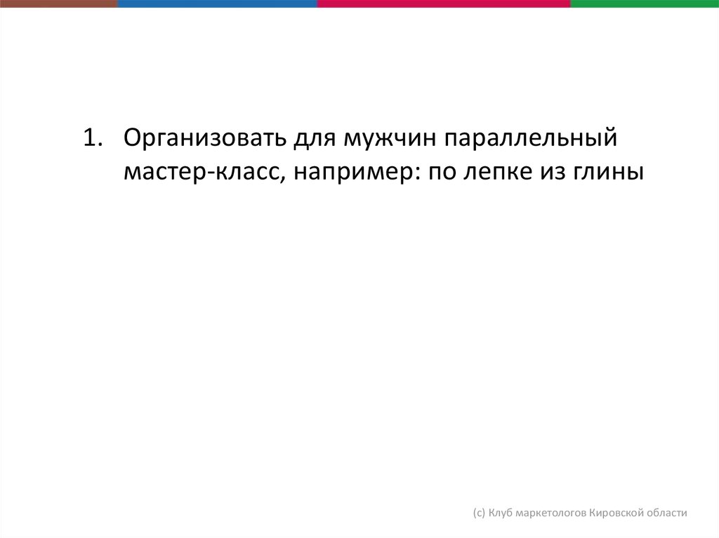 1. Организовать для мужчин параллельныймастер-класс, например: по лепке из глины