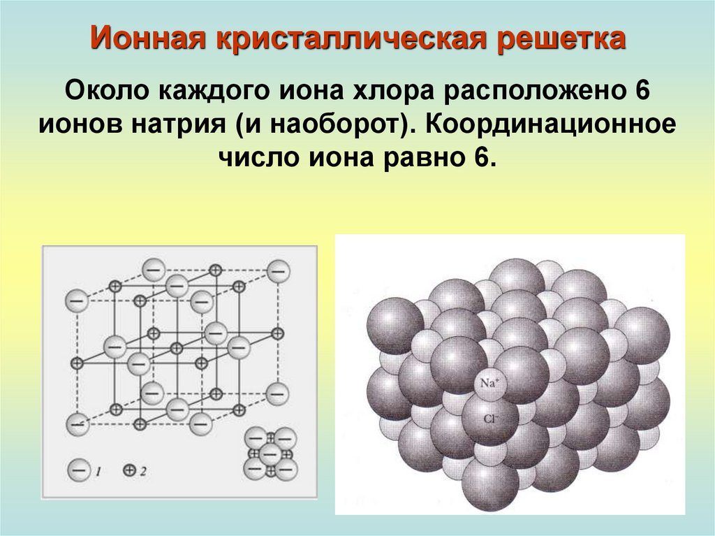 Ионная кристаллическая решеткаОколо каждого иона хлора расположено 6