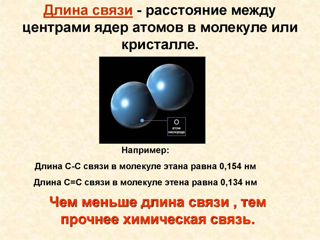 Длина связи - расстояние междуцентрами ядер атомов в молекуле или