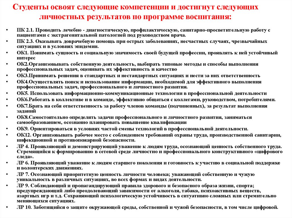Студенты освоят следующие компетенции и достигнут следующихличностных результатов по программе воспитания: