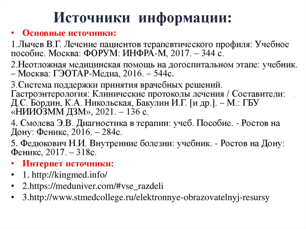 1.Лычев В.Г. Лечение пациентов терапевтического профиля: Учебное