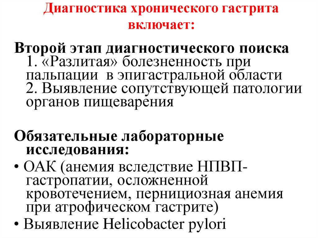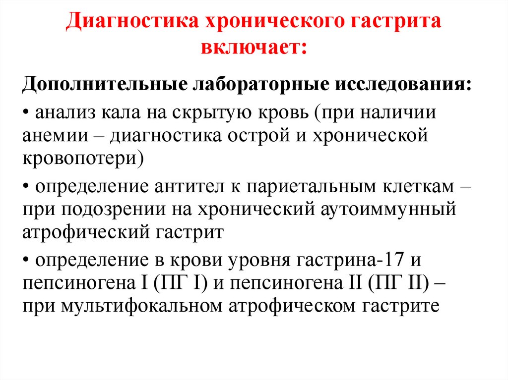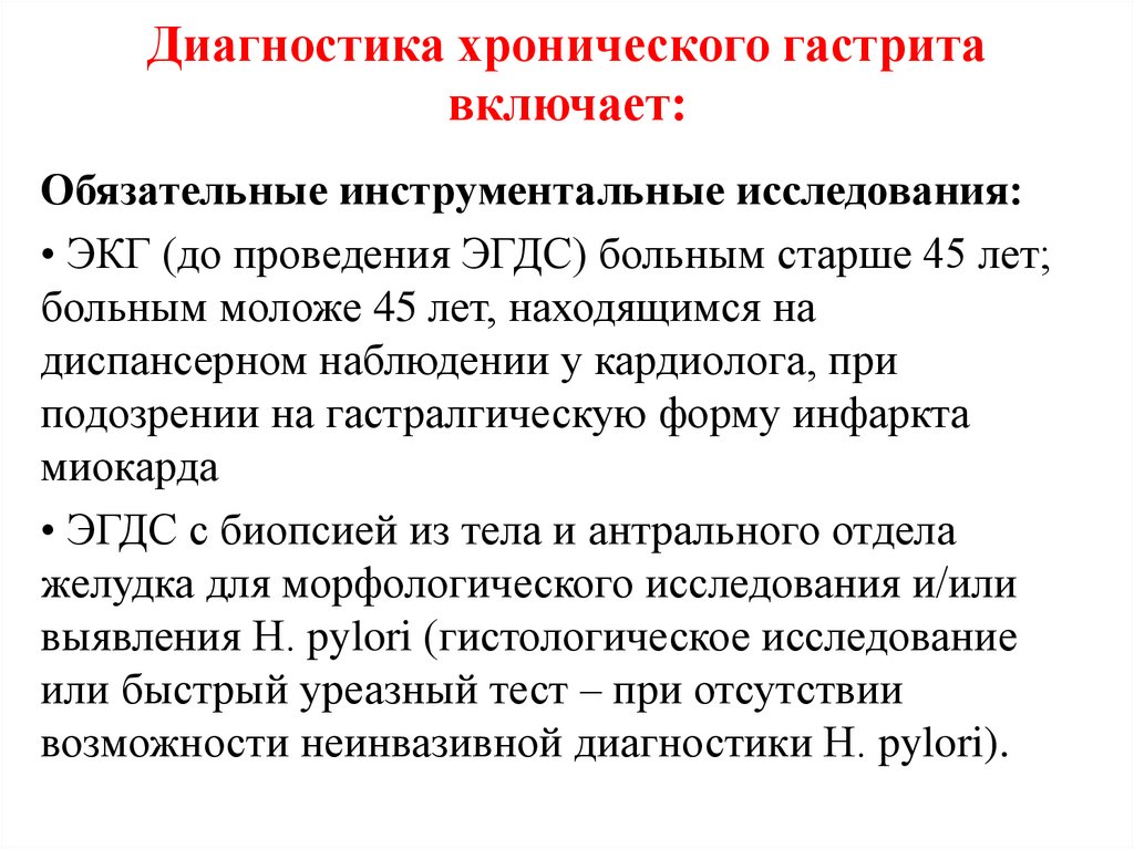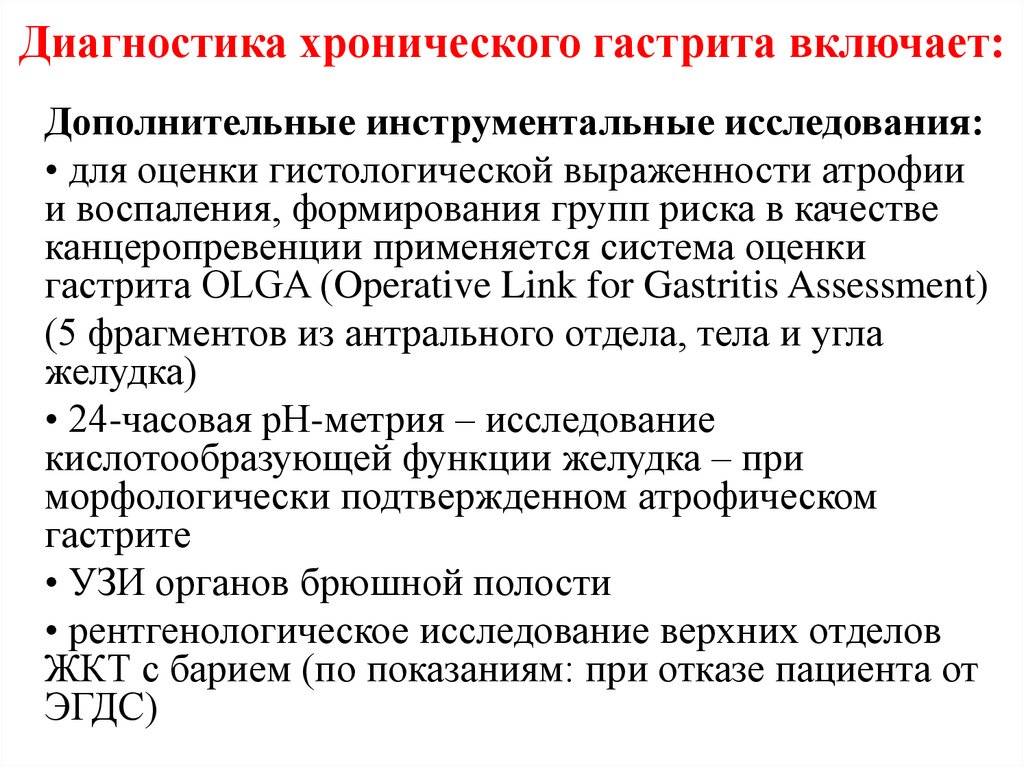 Диагностика хронического гастрита включает:Дополнительные инструментальные исследования: