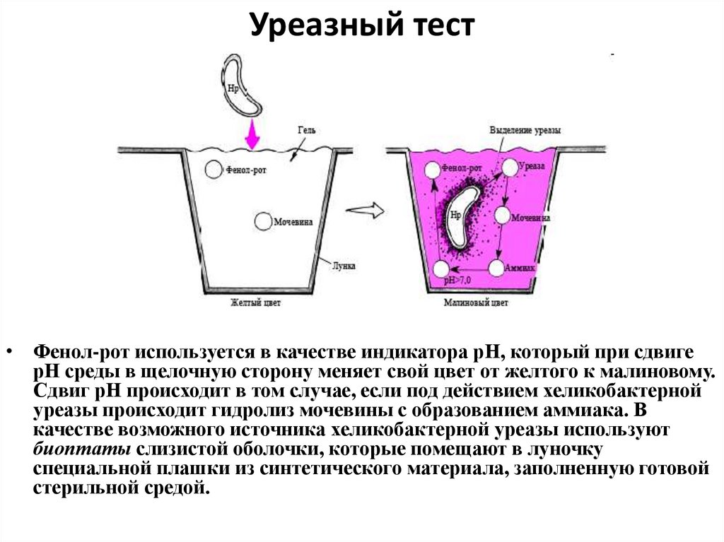 Уреазный тест• Фенол-рот используется в качестве индикатора рН, который при сдвиге