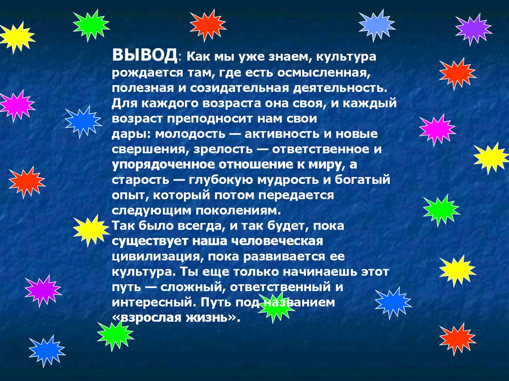 ВЫВОД: Как мы уже знаем, культурарождается там, где есть осмысленная,