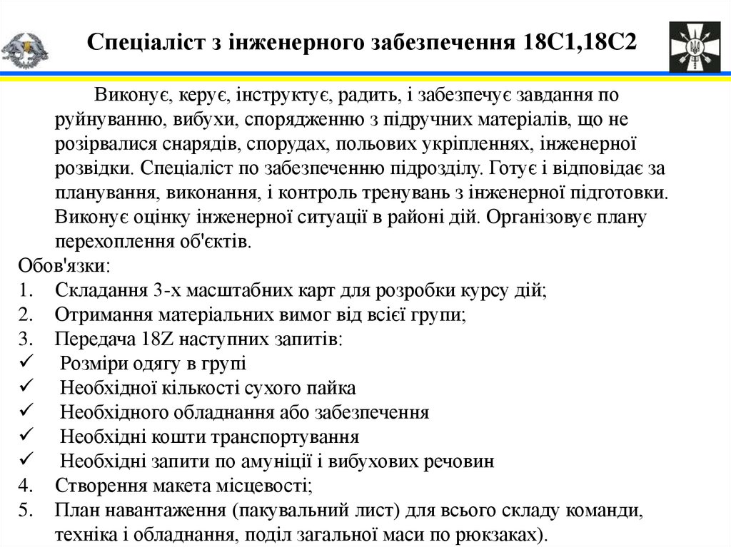 •Спеціаліст з інженерного забезпечення 18C1, 18C2 – командир