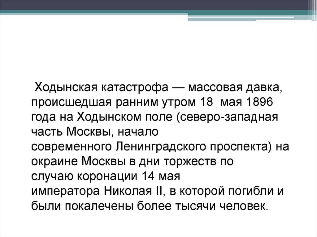 Ходынская катастрофа — массовая давка,происшедшая ранним утром 18 мая 1896