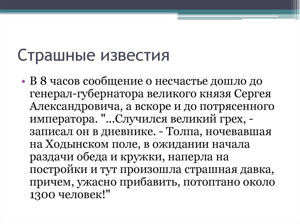 Страшные известия• В 8 часов сообщение о несчастье дошло до