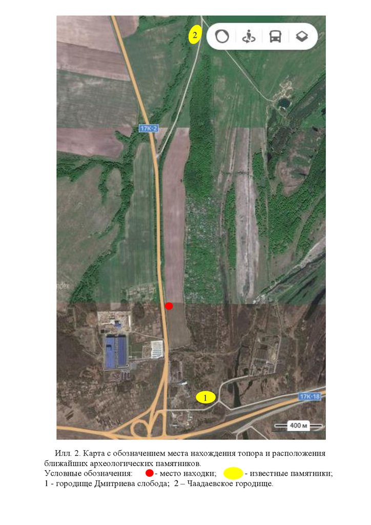 Илл. 2. Карта с обозначением места нахождения топора и расположенияближайших археологических памятников.