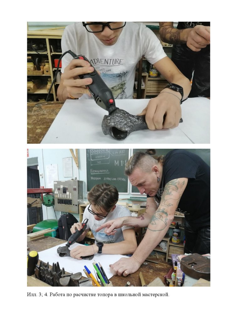 Илл. 3; 4. Работа по расчистке топора в школьной мастерской.4.