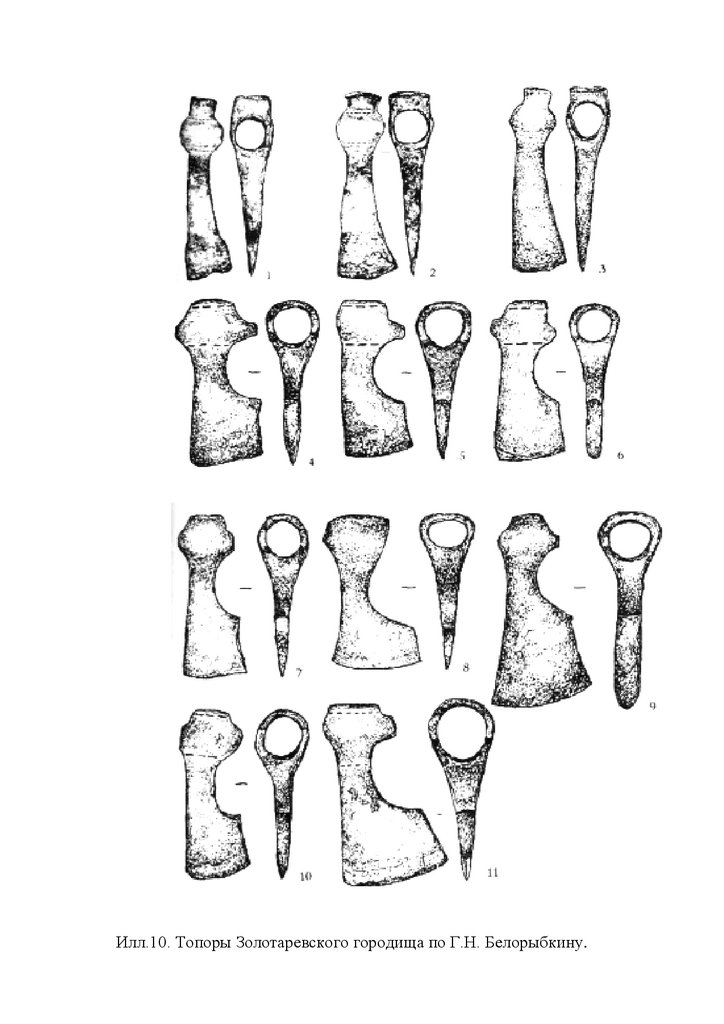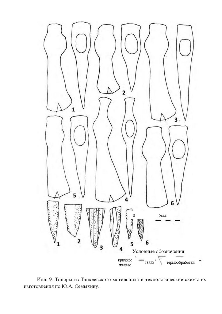 Илл. 9. Топоры из Танкеевского могильника и технологические схемы их