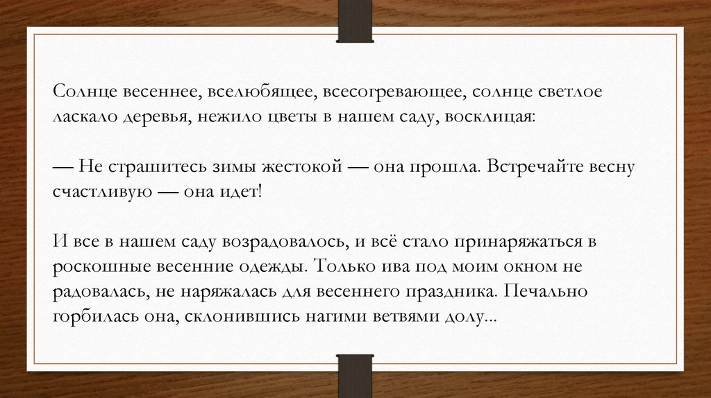 Солнце весеннее, вселюбящее, всесогревающее, солнце светлоеласкало деревья, нежило цветы в нашем саду, восклицая: