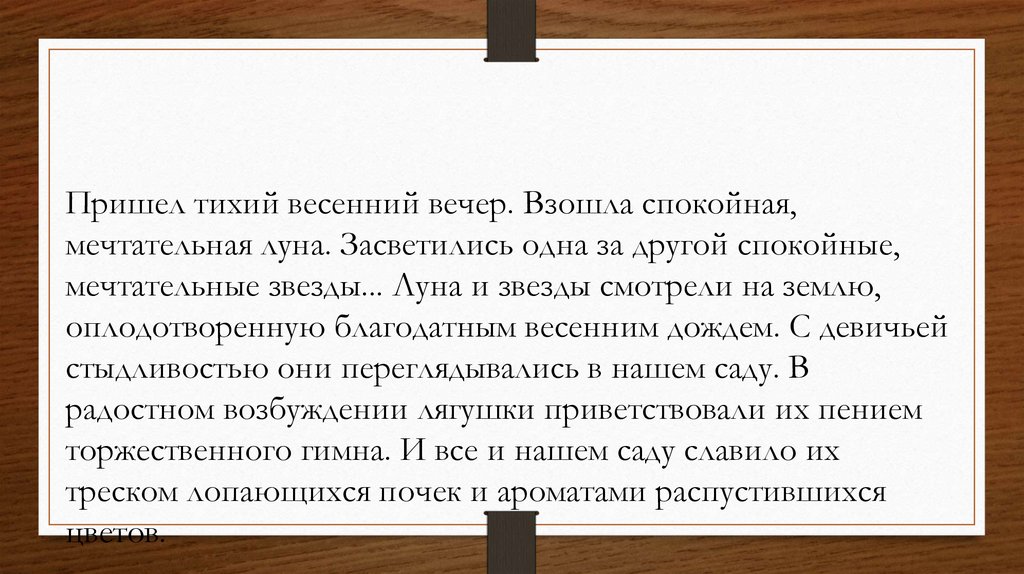 Пришел тихий весенний вечер. Взошла спокойная,мечтательная луна. Засветились одна за другой спокойные,