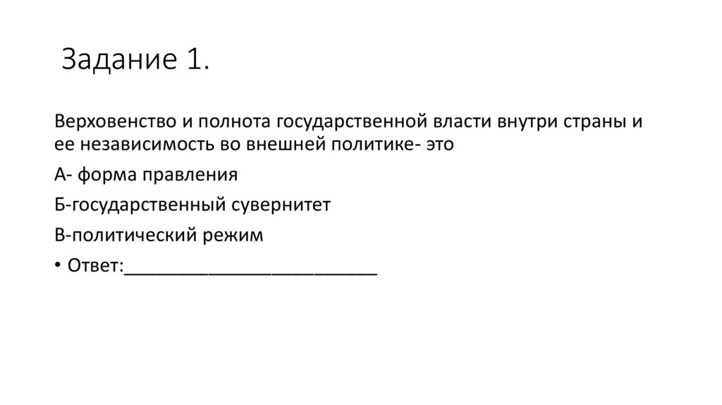 Задание 1.Верховенство и полнота государственной власти внутри страны и