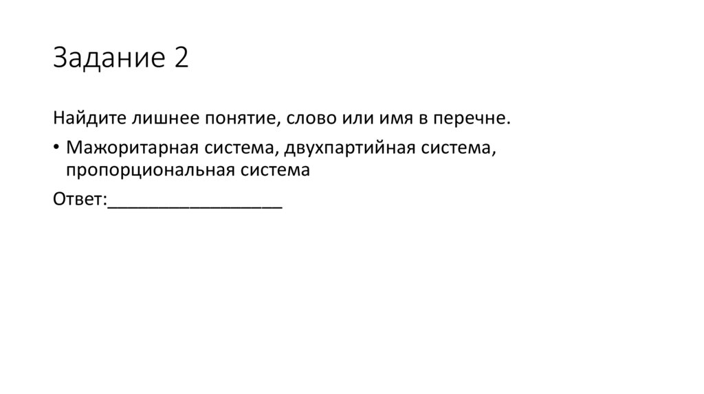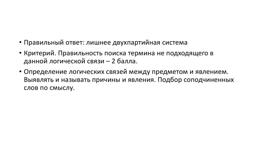 • Правильный ответ: лишнее двухпартийная система• Критерий. Правильность поиска термина не подходящего в