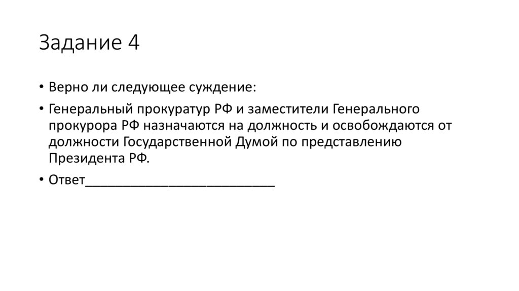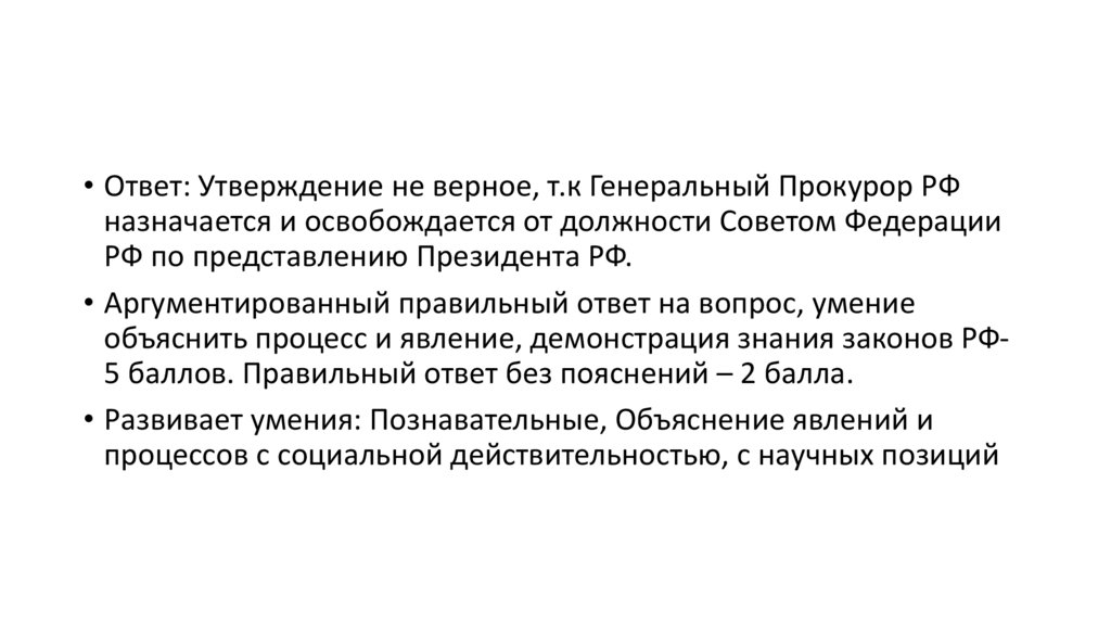 • Ответ: Утверждение не верное, т.к Генеральный Прокурор РФназначается и освобождается от должности Советом Федерации