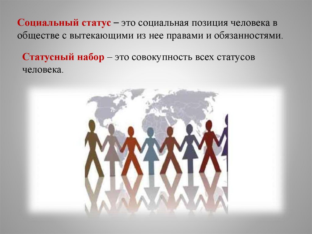 Социальный статус – это социальная позиция человека вобществе с вытекающими из нее правами и обязанностями.