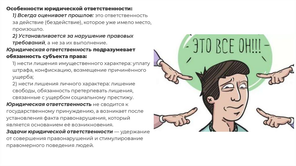 Особенности юридической ответственности:1) Всегда оценивает прошлое: это ответственность