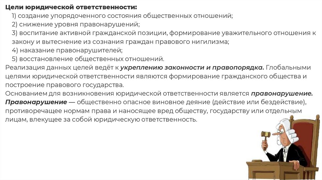 Цели юридической ответственности:1) создание упорядоченного состояния общественных отношений;
