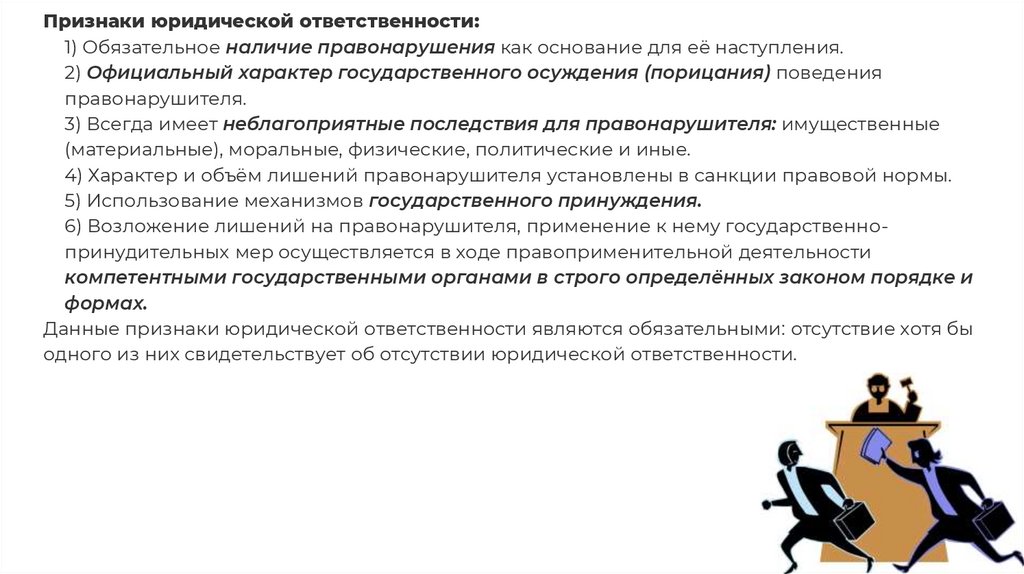 Данные признаки юридической ответственности являются обязательными: отсутствие хотя бы