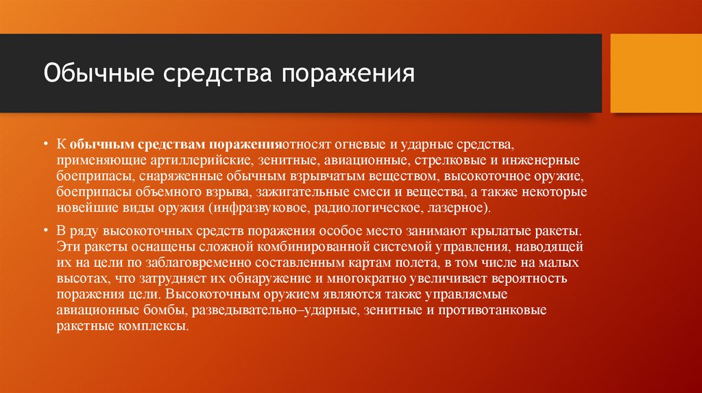 Обычные средства поражения• К обычным средствам пораженияотносят огневые и ударные средства,