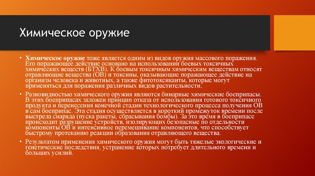 • Результатом применения химического оружия могут быть тяжелые экологические и