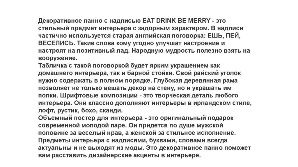 Декоративное панно с надписью EAT DRINK BE MERRY - этостильный предмет интерьера с задорным характером. В надписи