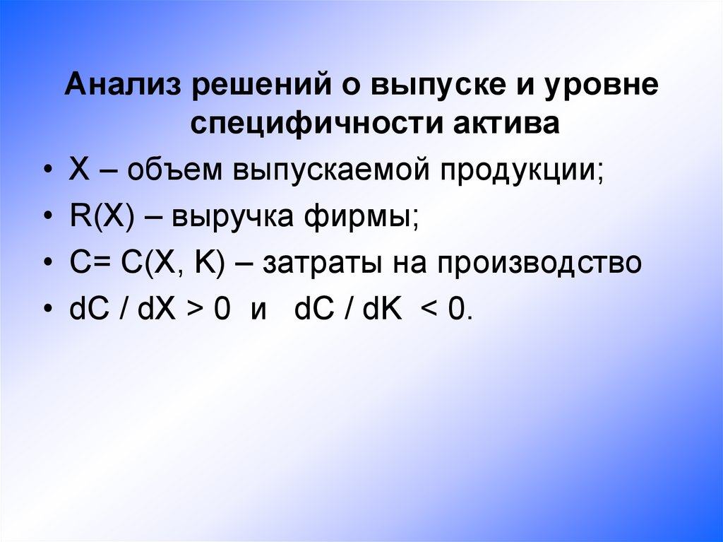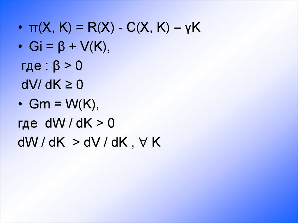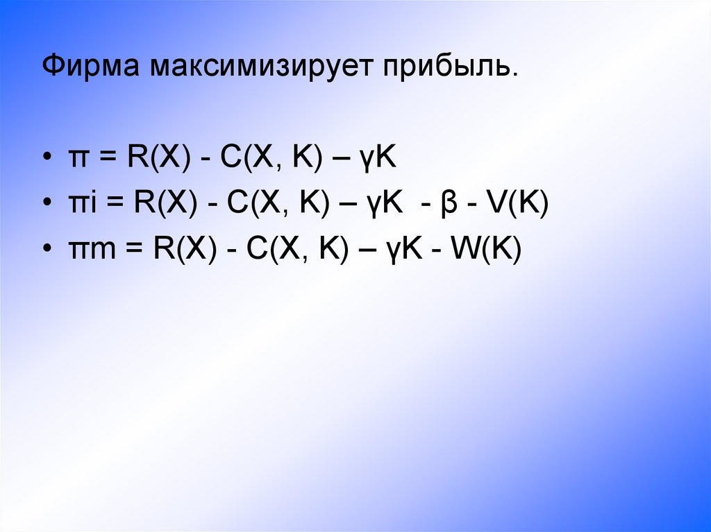Фирма максимизирует прибыль.• π = R(X) - C(X, K) – γK