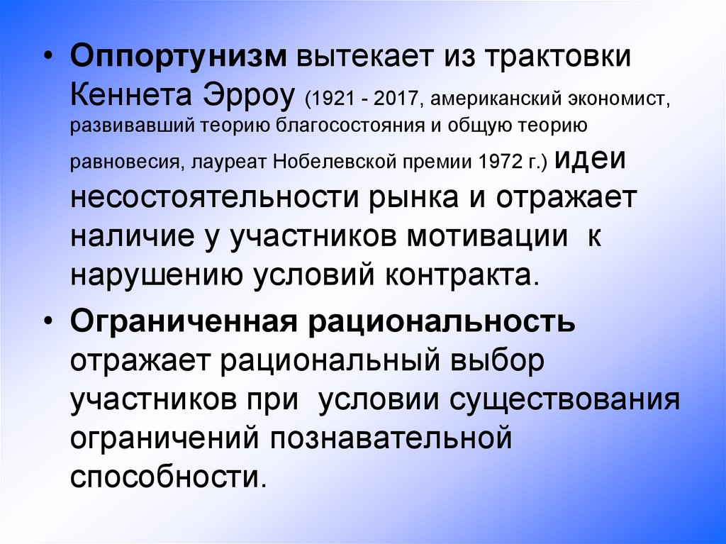 • Оппортунизм вытекает из трактовкиКеннета Эрроу (1921 - 2017, американский экономист,
