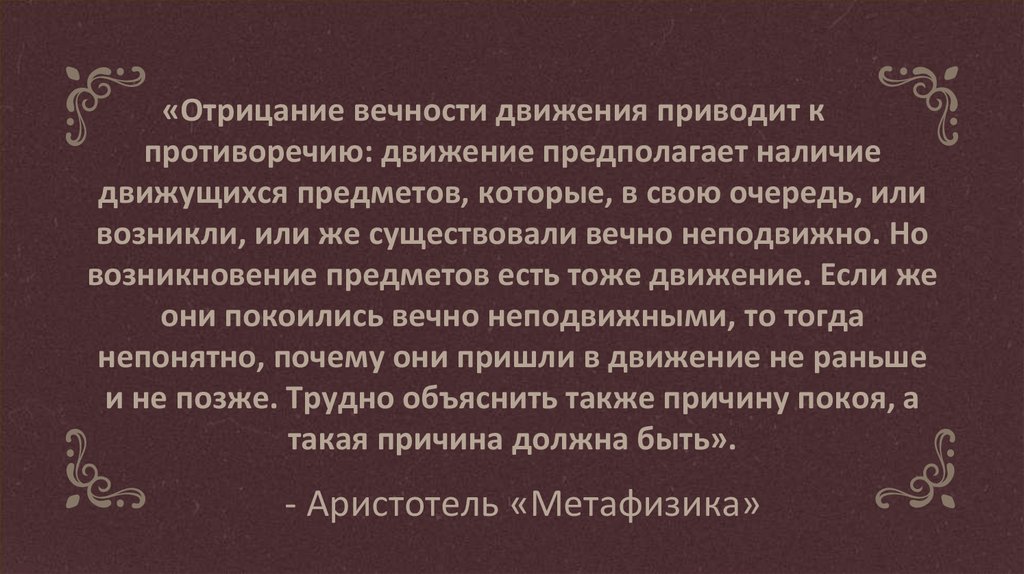 «Отрицание вечности движения приводит кпротиворечию: движение предполагает наличие