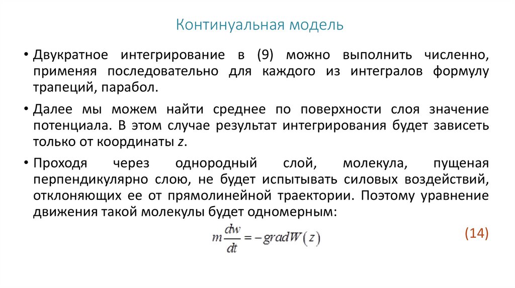 Континуальная модель• Двукратное интегрирование в (9) можно выполнить численно,